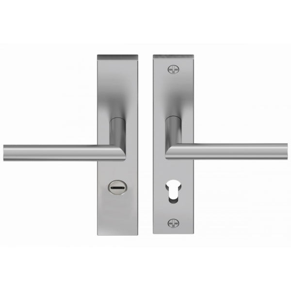 Veiligheidsset "Quadro" voorzien van antikerntrek beveiliging met SKG3 keurmerk. De set is vervaardigd uit zeer hoogwaardig RVS. Aan beide kanten heeft de veiligheidsset een deurkruk. Deze set is geschikt voor veelvuldig (commercieel) gebruik.meer